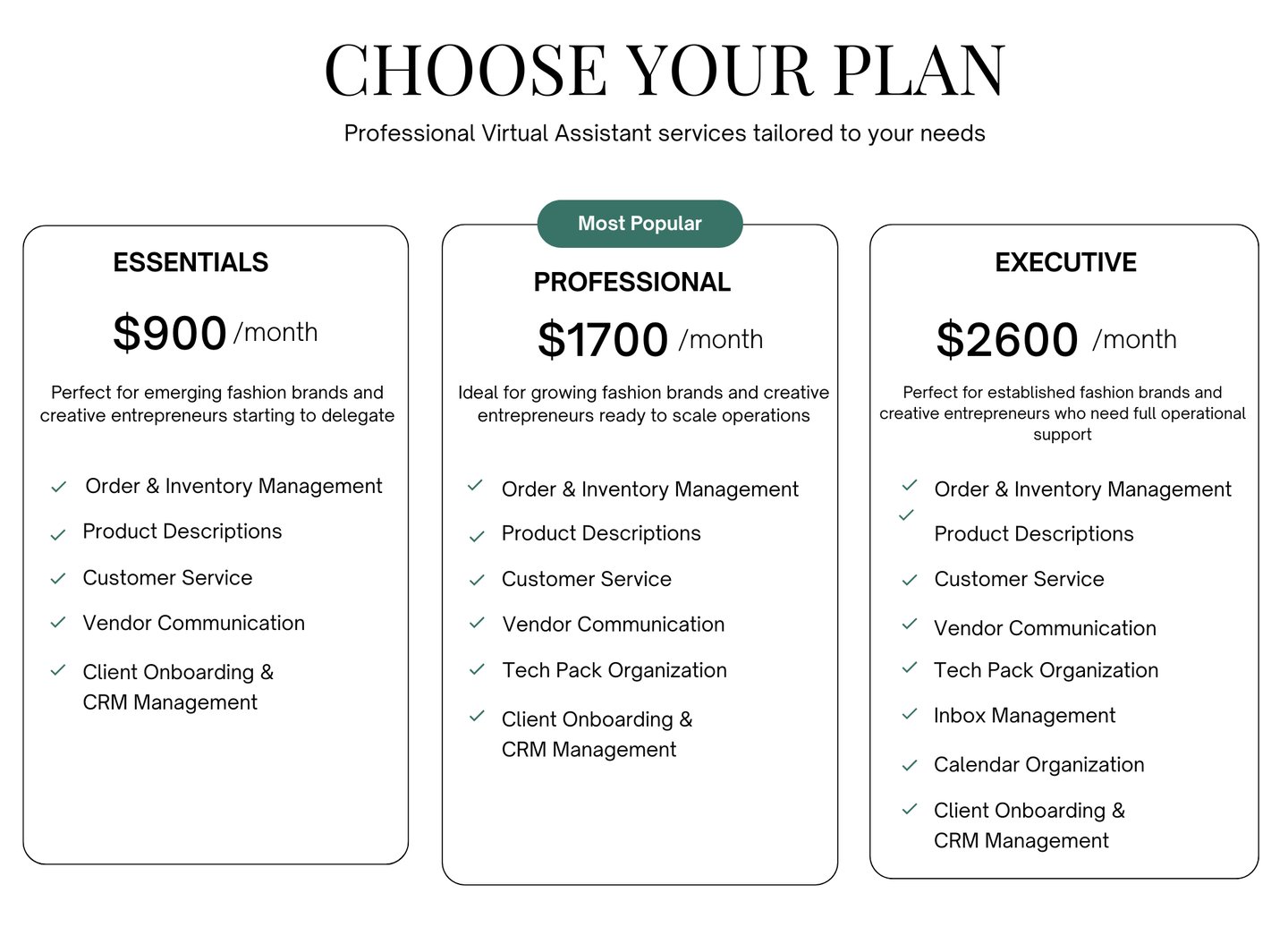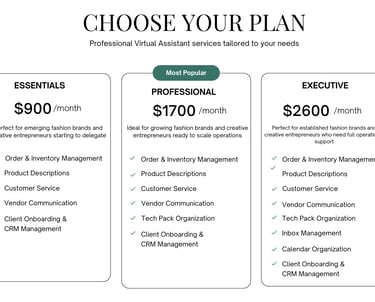 Whether you’re an emerging, growing or established brand, we offer flexible support options designed to help you stay organized and supported in your business. From one-time projects to ongoing support, each service is designed to help you stay organized, manage operations smoothly, and focus on what you do best.