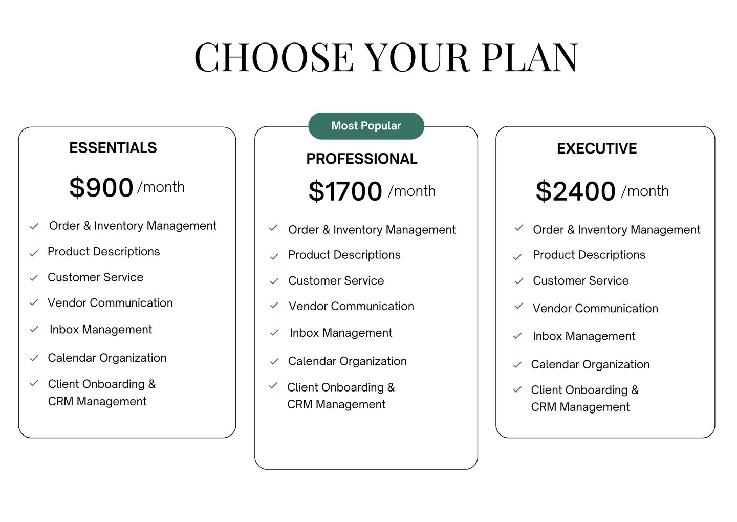 Perfect for new clients who want a focused, one-time project. These services include product description and client onboarding & CRM management.